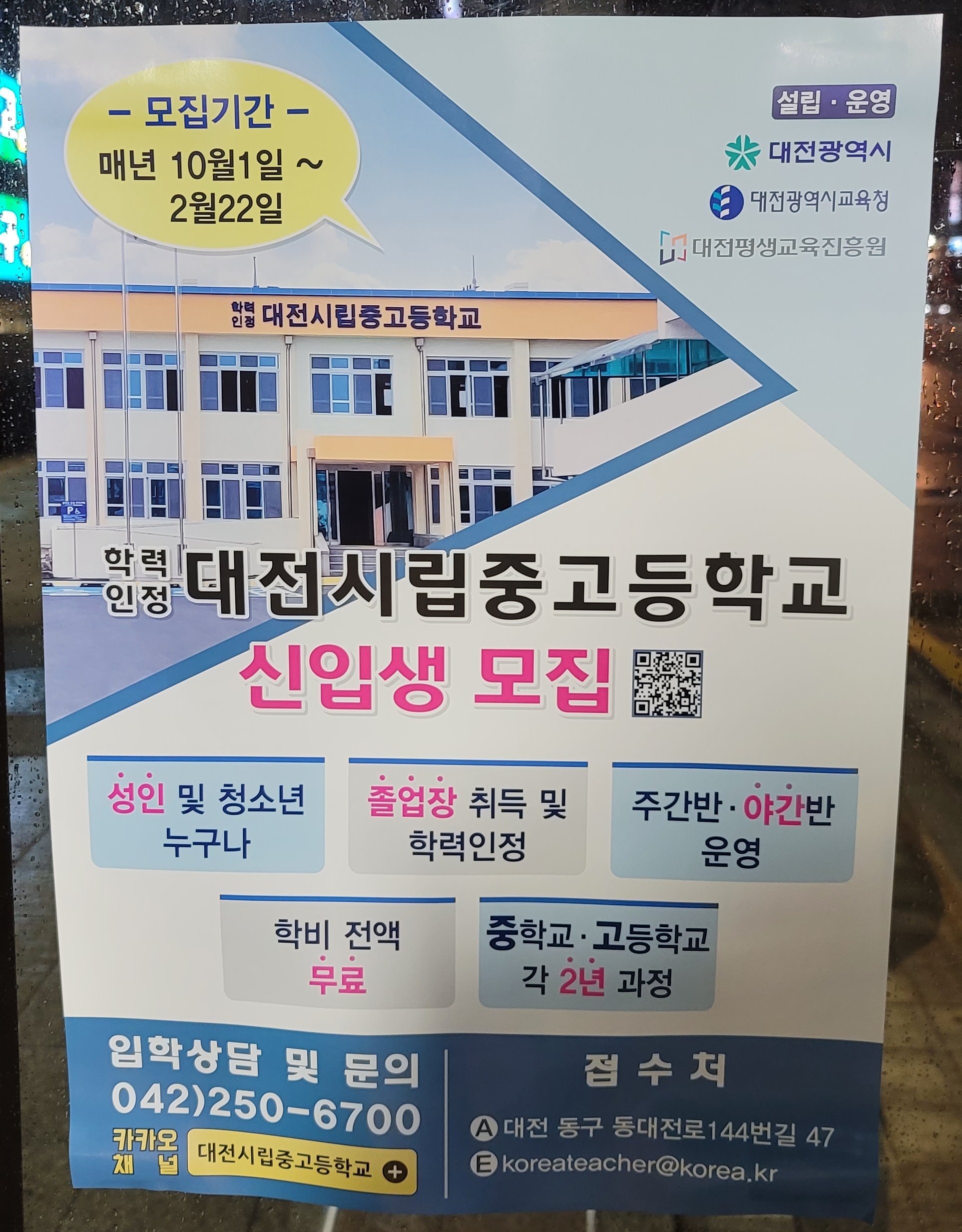 자세한 입학 관련 문의는 전화 042-250-6700 및 카카오톡 채널(대전시립중고등학교)를 이용하면 된다.